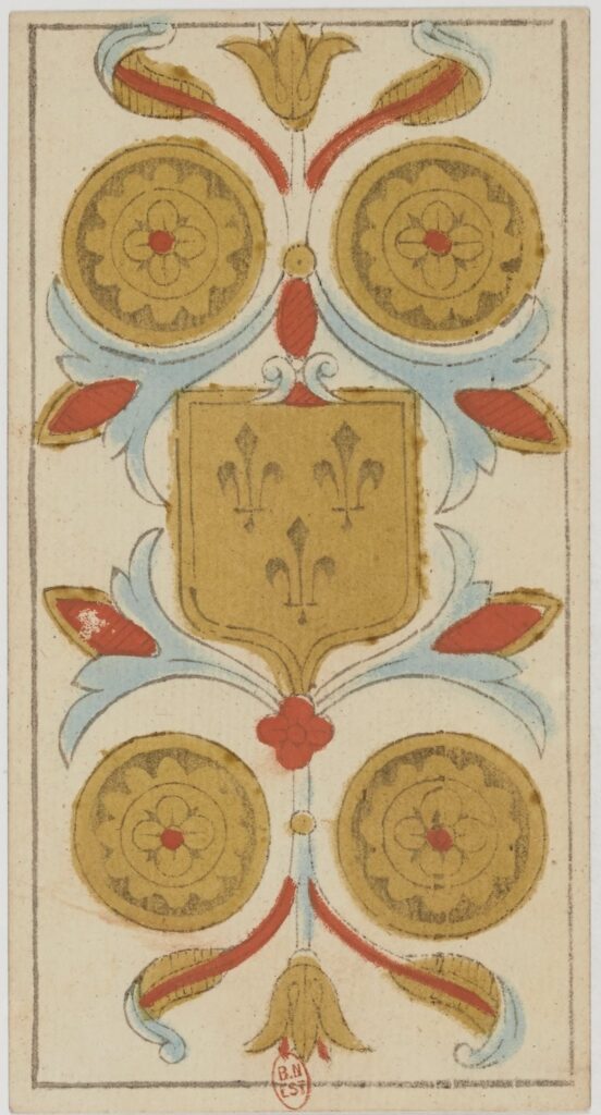 Además, el escudo es el verdadero elemento unificador de la carta. Sin él, la imagen se fragmenta de manera evidente: dos monedas a un lado, dos monedas al otro, sin un eje claro que las articule. Es el escudo el que reúne, el que da sentido, el que permite que la carta funcione como una totalidad orgánica, tanto visual como simbólicamente. En él convergen la nobleza, la flor de lis, el arraigo, la propiedad, la firmeza.