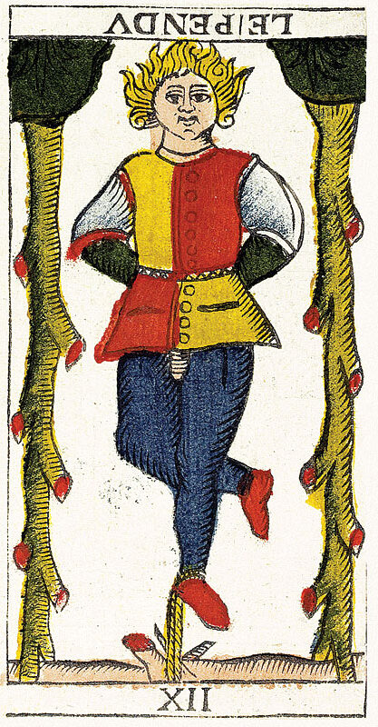La carta de El Colgado es una carta muy particular dentro de los arquetipos del Tarot de Marsella. Es interesante abordarla comenzando por mirarla al revés, ya que, cuando la colocamos de manera invertida, observamos el personaje «al derecho».